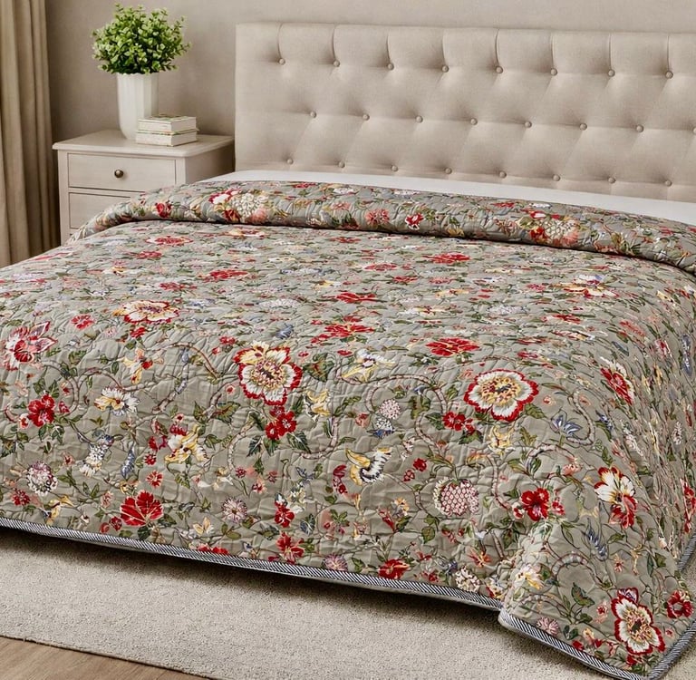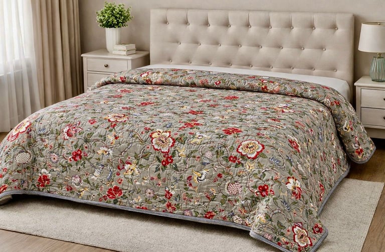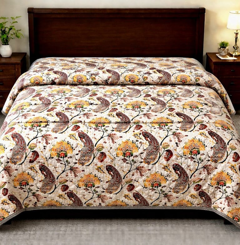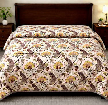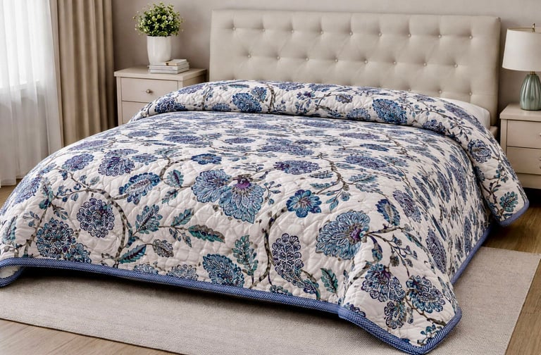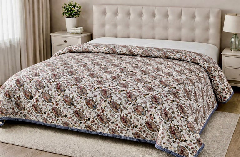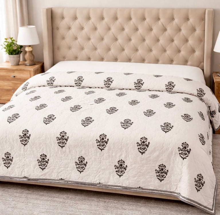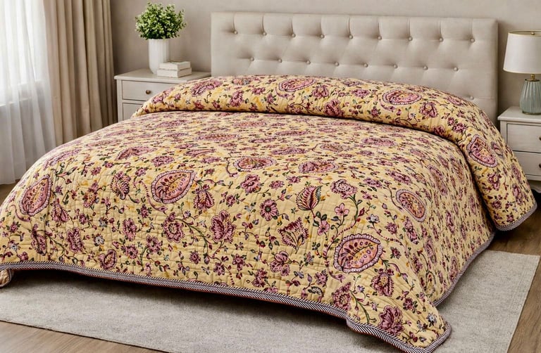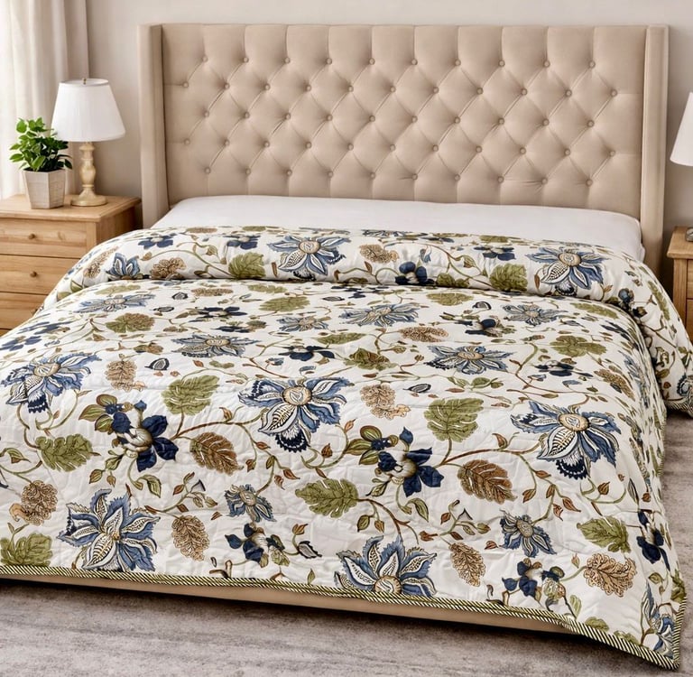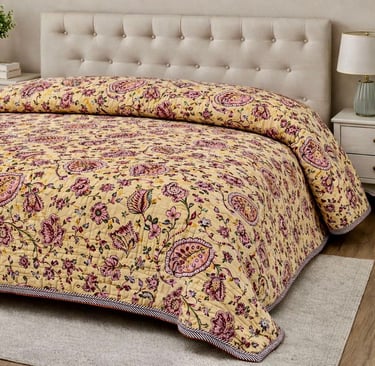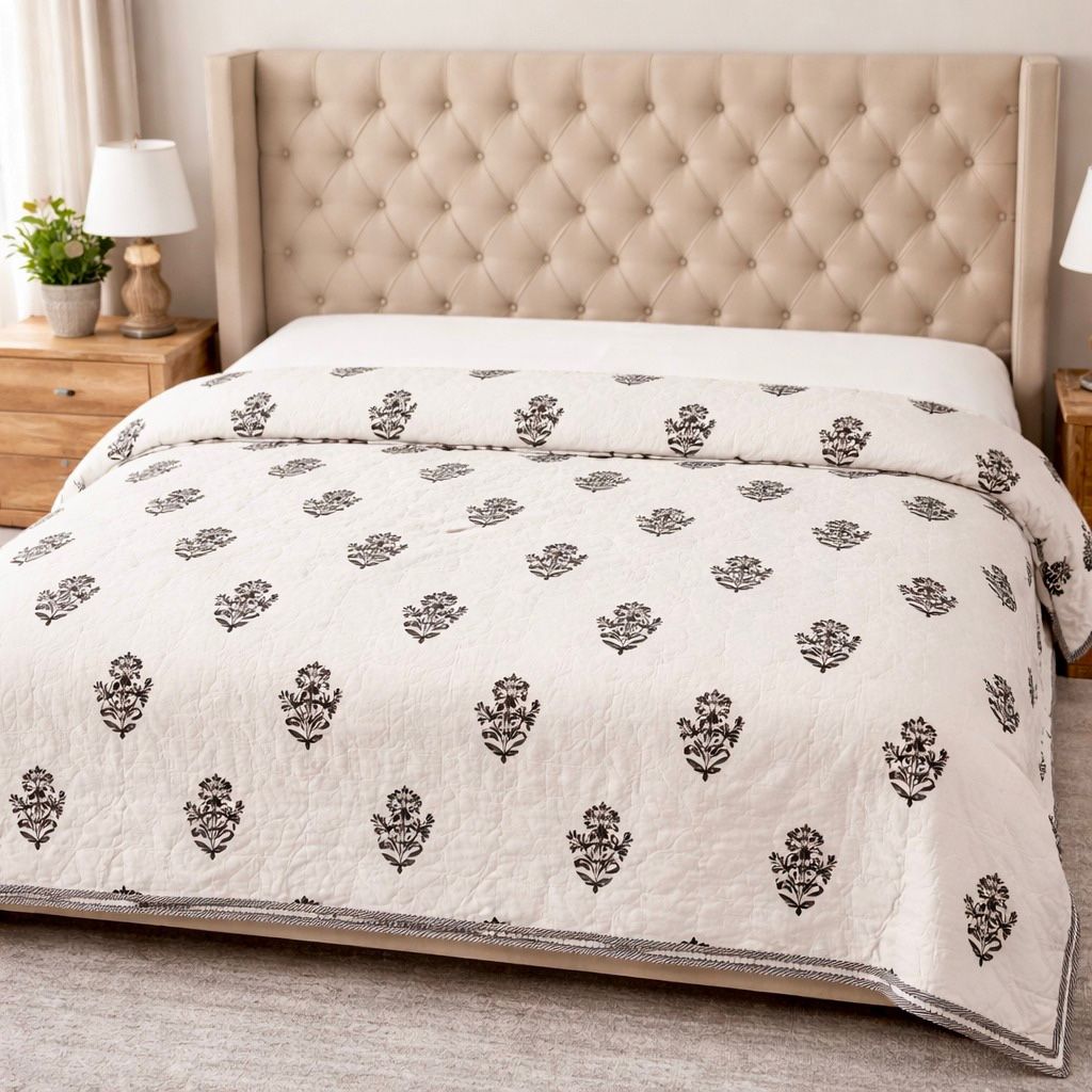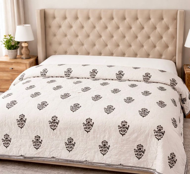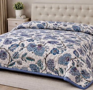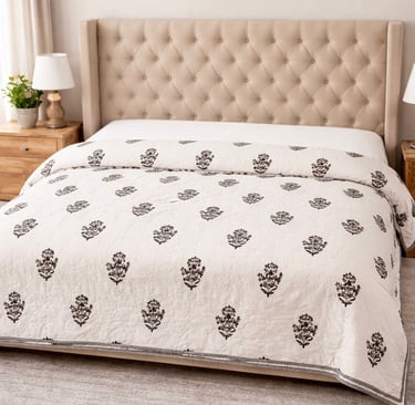 Our Jaipuri quilts are a perfect blend of traditional Indian craftsmanship and modern comfort. Handcrafted using soft cotton fabric and natural cotton filling, these quilts are lightweight, breathable, and ideal for year-round use. Inspired by the rich textile heritage of Jaipur, each quilt features intricate block prints, elegant patterns, and vibrant yet balanced color combinations that add a timeless charm to bedroom interiors.