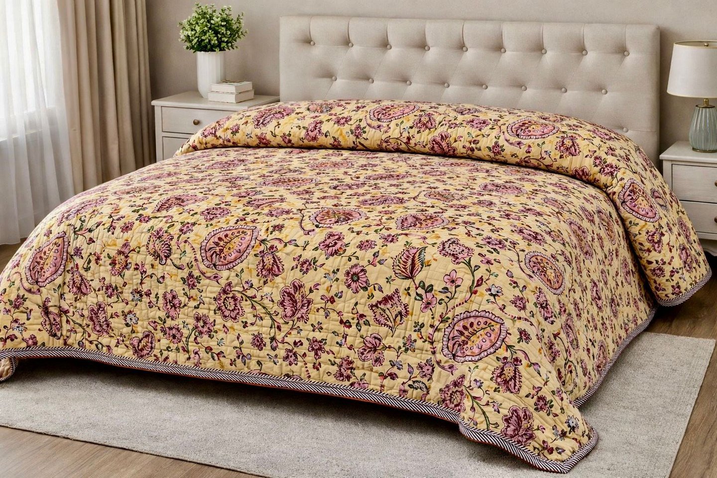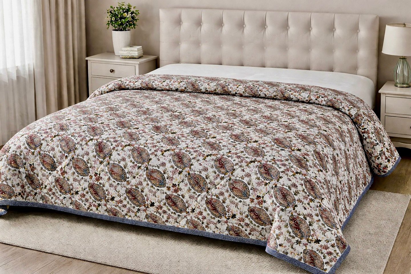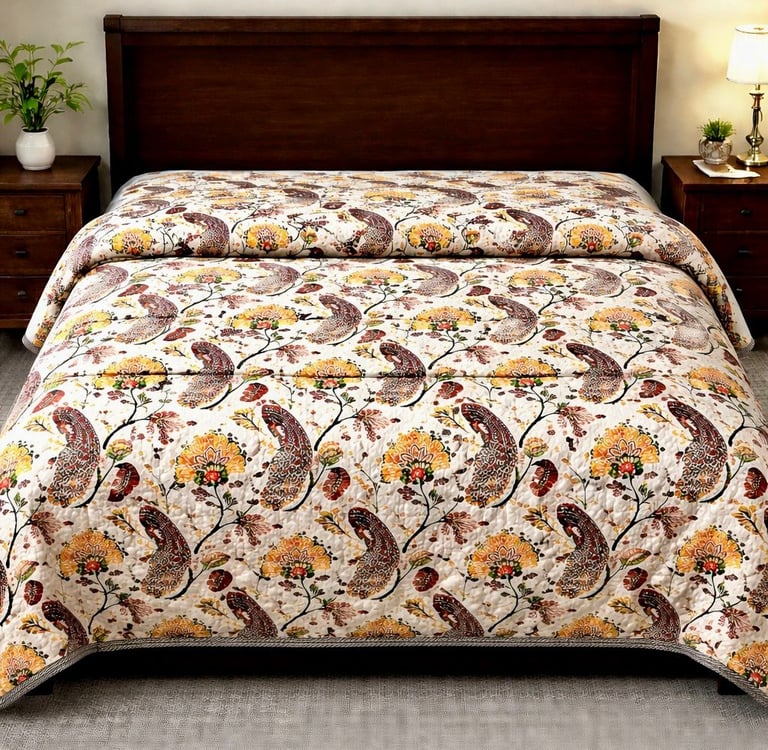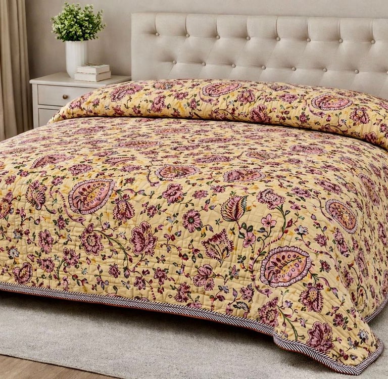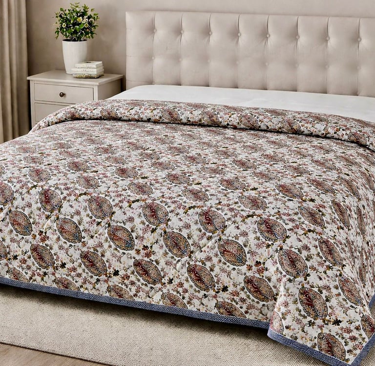 Designed for both comfort and durability, Jaipuri quilts provide gentle warmth without heaviness, making them suitable for homes, hotels, resorts, and export markets worldwide. The fine stitching ensures long-lasting shape and softness even after repeated use. We offer customization in size, print, color, filling thickness, and packaging to meet private label and bulk buyer requirements. Manufactured under strict quality control, our Jaipuri quilts meet international export standards.